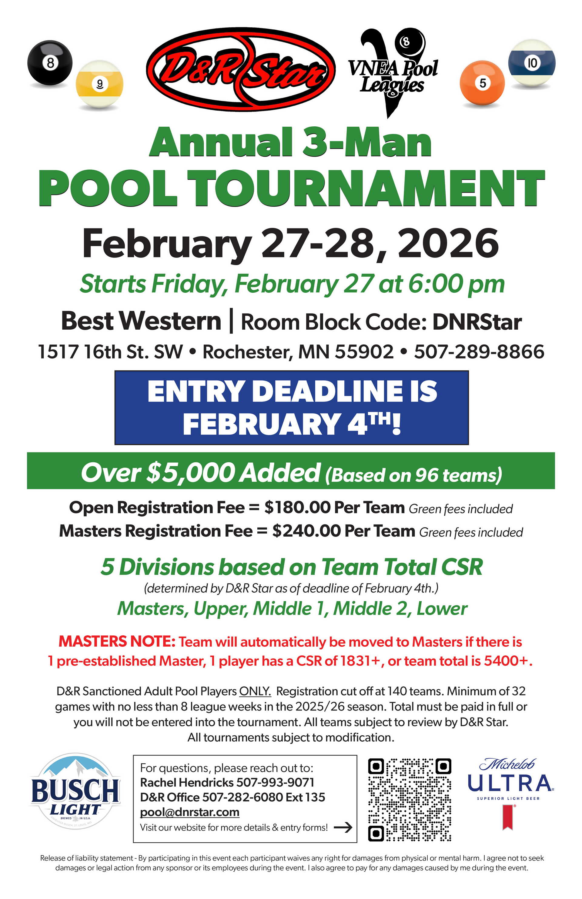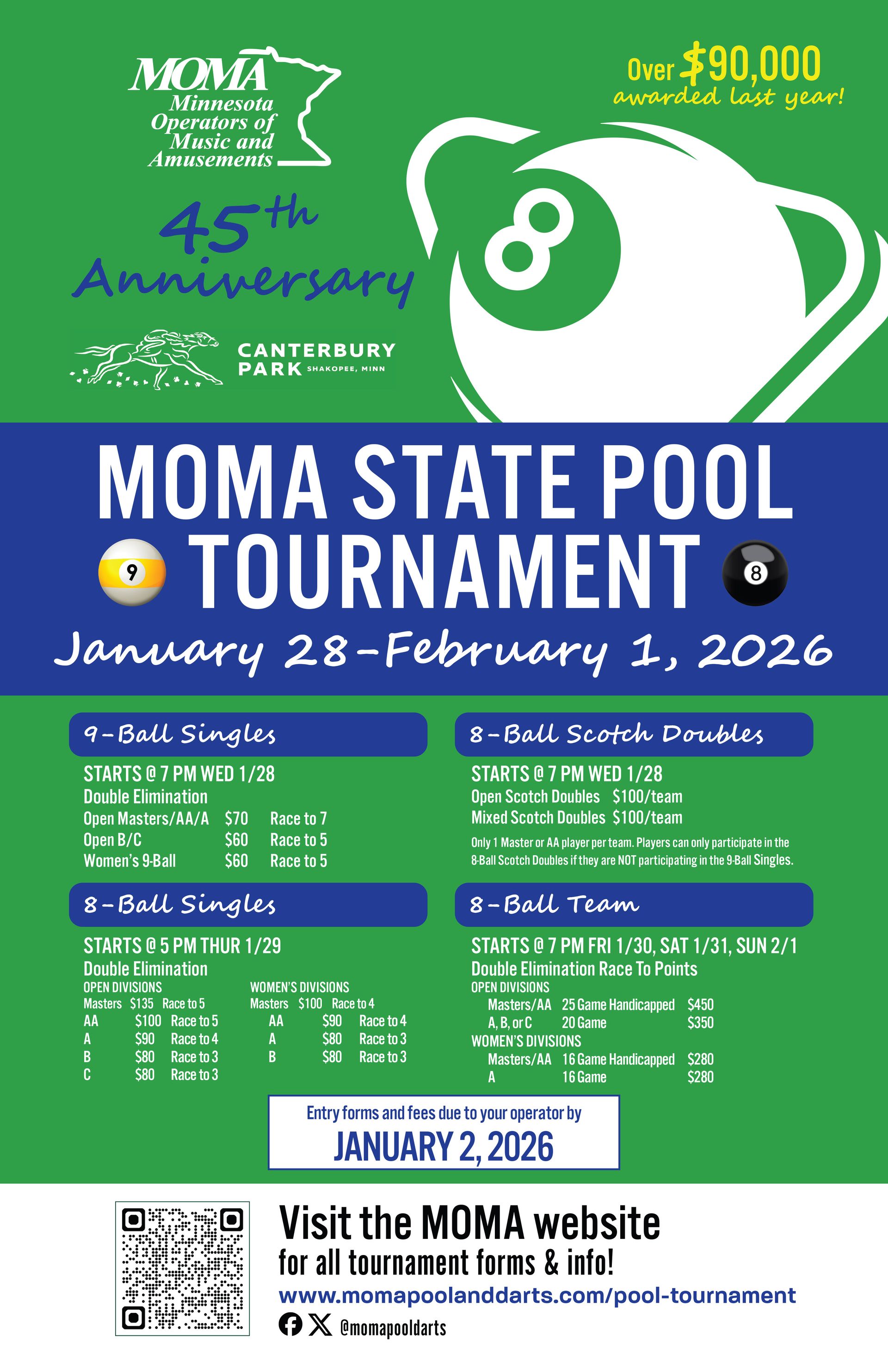 8-Ball Singles, 8-Ball Scotch Doubles, 9-Ball Singles, 8-Ball Team. Entry forms and fees due to D&R by January 2, 2026.
