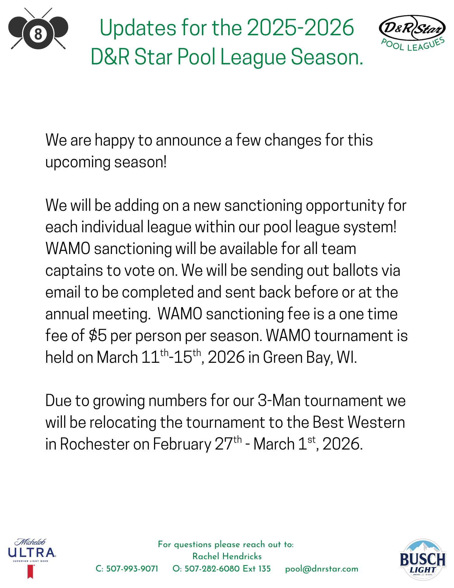 Updates for the 2025-2026 D&R Star Pool League Season