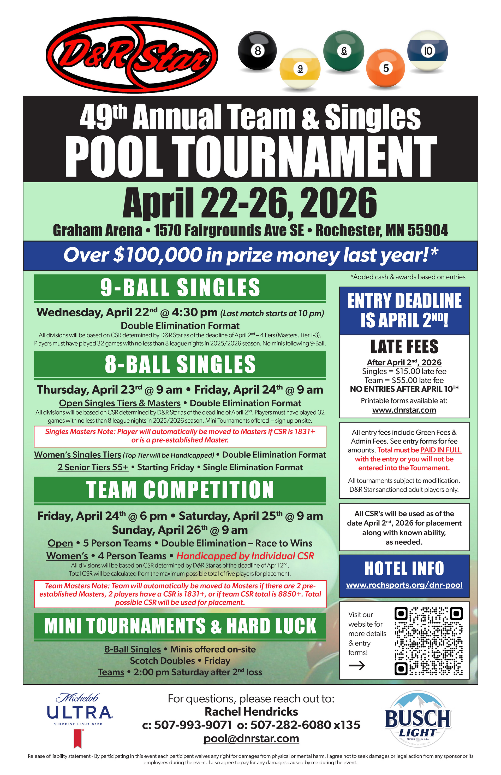 Over $100,000 in prize money last year! 8-Ball Singles, 9-Ball Singles, Team, Mini Tournaments, and Hard Luck. Entry deadline is April 2, 2026.
